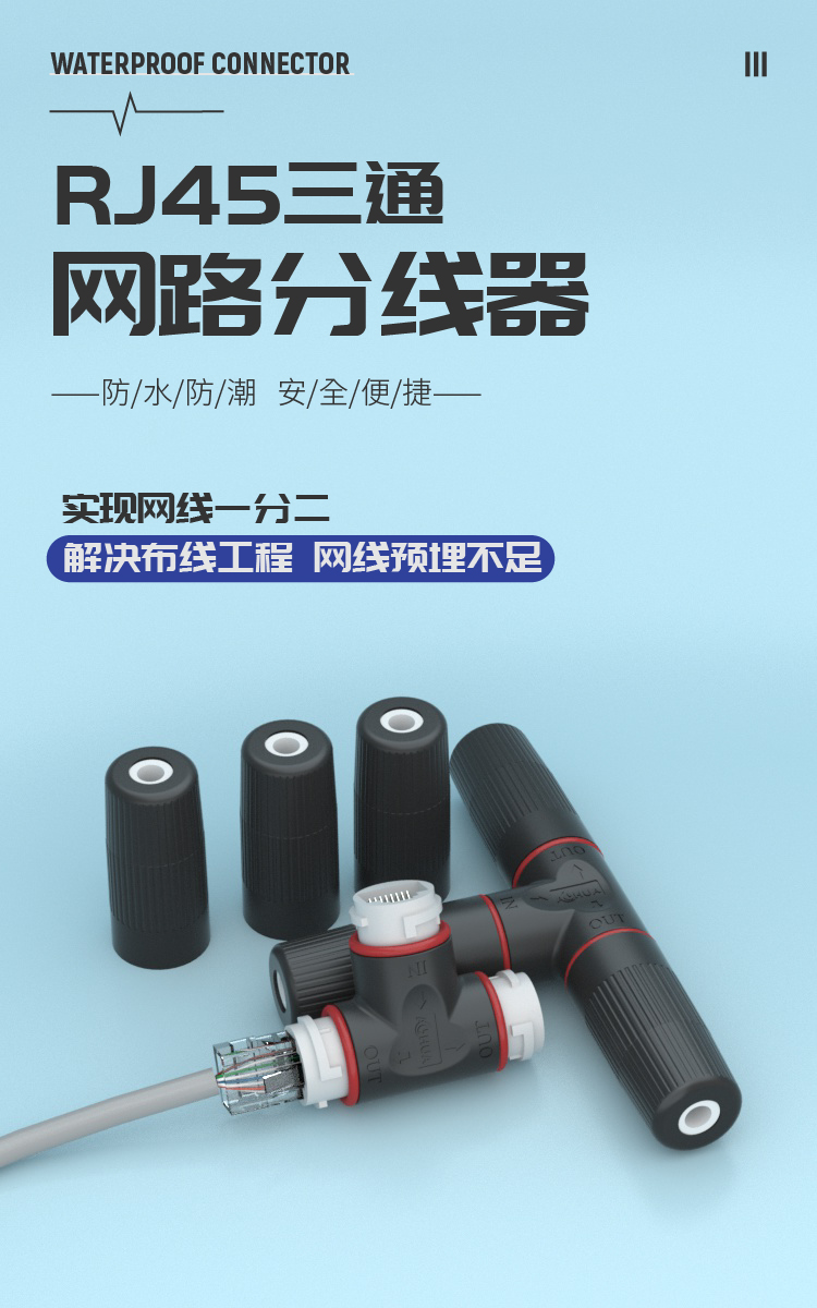 隨著5G時代到來,人們的生活將進入該萬物互聯(lián)時代,越來越多的場合和家庭都安裝了電子監(jiān)控等通信設(shè)備。隨著應(yīng)運而生的就是下面這個RJ45三通連接器,完美決絕了網(wǎng)絡(luò)傳輸多路同時使用的問題,兩個三通接頭成對使用,將一條8芯網(wǎng)線分為兩條4芯網(wǎng)線使用,適用于10M/100M以太網(wǎng)傳輸。